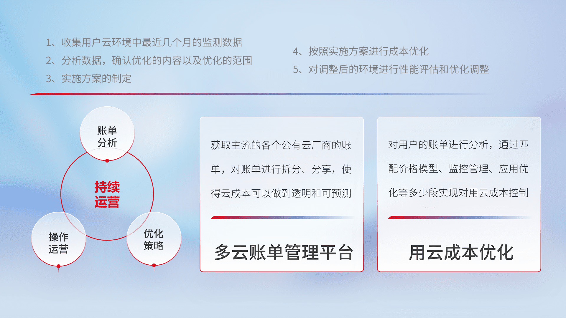 通过灵活运用多种自动化迁移工具,,帮助企业用户实现业务和数据高效 、、稳定的上云迁移和云上迁移,,,,采用自研多云纳管平台,,以中立管理模式,,,,解决多组织、、、多云、、、多运维厂商的复杂关系的管理,,,,保证多云平台资源配置的一致性,,,实时掌控云资源运行数据,,,运用智能化工具分析云资源多云平台的管理服务,,,,透明化管理成本支出,,用云成本可预测、、、、用云费用可优化、、、云资源配额有据可依。。。