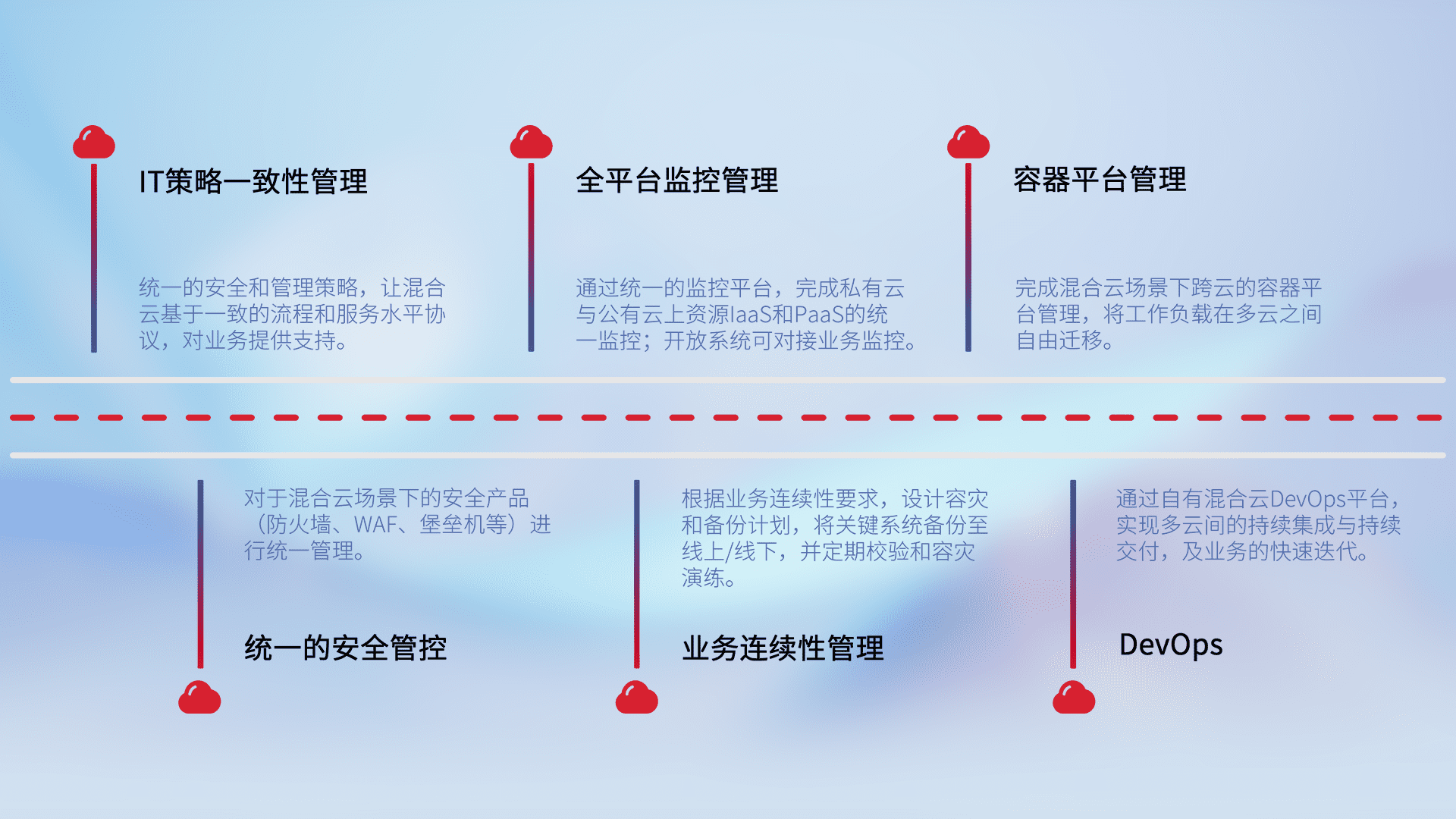 通过多云纳管,,,以统一的资源数据模型把客户的云资源进行抽象和封装,,,,进而实现对多云资源的统一操作,,,,保障云资源管理的可靠性、、、稳定性与可用性。。量身定制化运维内容,,,,配置、、开发运维、、、补丁管理、、备份、、、监控、、认证和访问管理、、、审计和日常巡检等,,保障在用云过程中的可靠度,,,,稳定度以及高可用率。。。。