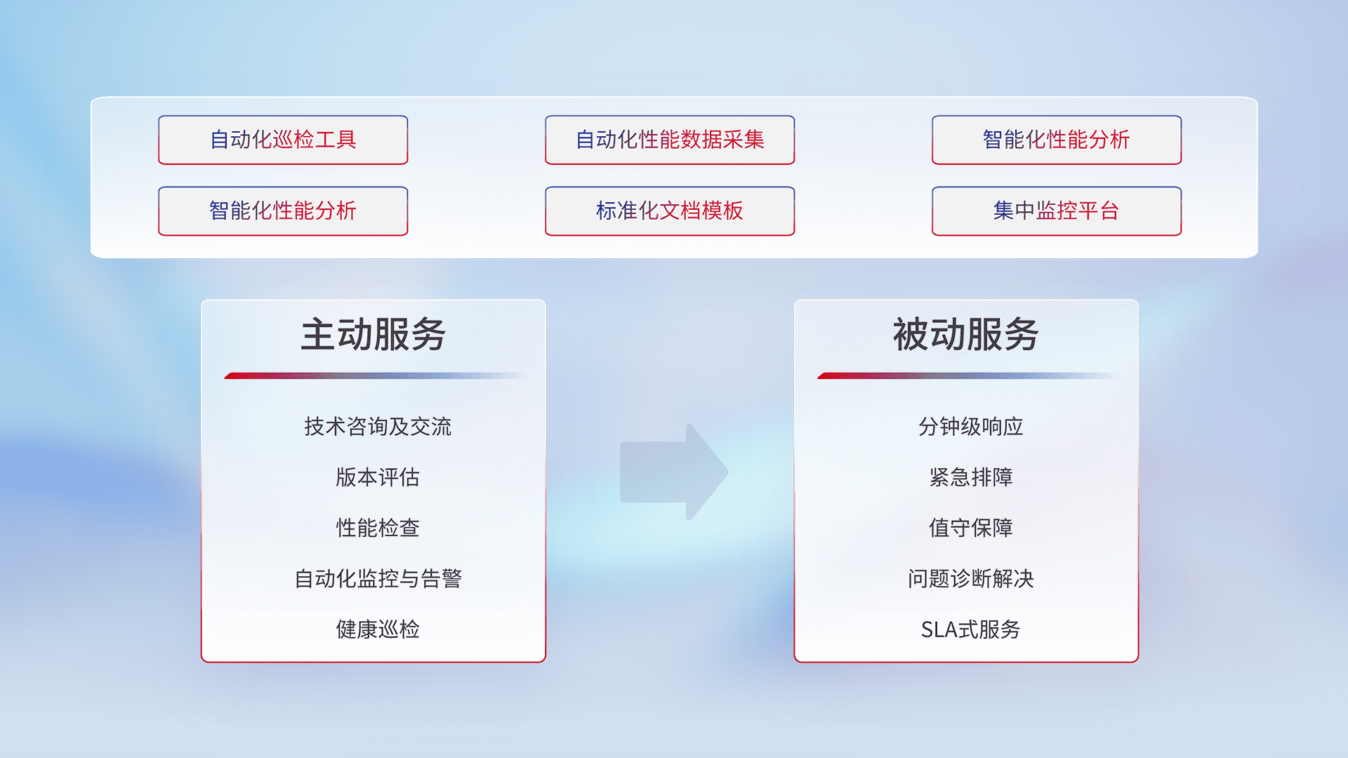 智能化工具和标准化文档,,保障服务质量,,,,提供主动服务(包含技术咨询、、版本评估、、、性能检查、、、、自动化监控与告警、、健康巡检)和被动服务包含(分钟级响应、、紧急排障、、、值守保障、、、、问题诊断解决、、、SLA服务)。。。。